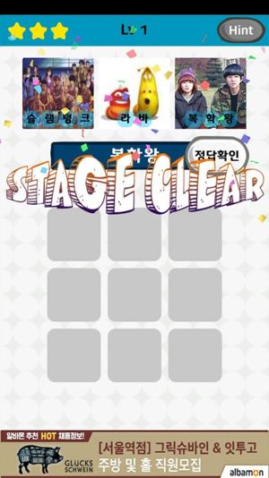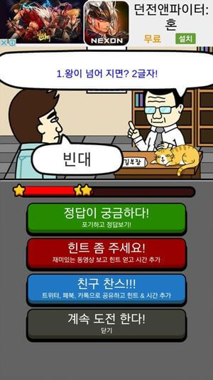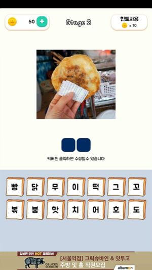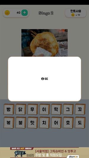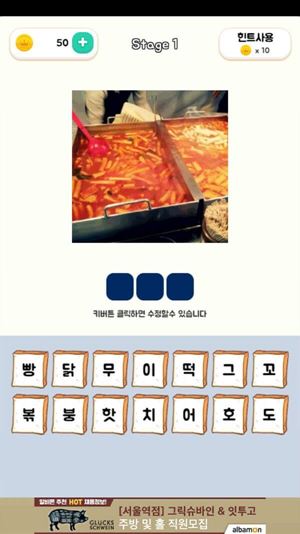 ´©±¸³ª ÇÑ ¹øÂëÀº ±æ°Å¸®¿¡¼ À½½ÄÀ» »ç ¸Ô¾îº» °æÇèÀÌ ÀÖÀ» °ÍÀÌ´Ù. ÀÌ·± °æÇè¿¡ Âø¾ÈÇÏ¿© ÄûÁ Áñ±æ ¼ö ÀÖµµ·Ï °³¹ßµÈ ±æ°Å¸® À½½Ä ÄûÁî ¾ÛÀº ȸ鿡 Á¦°øµÇ´Â À̹ÌÁö¸¦ º¸°í ÇØ´ç À½½Ä À̸§À» ÀÔ·ÂÇÏ¸é¼ ½ºÅ×ÀÌÁö¸¦ °ø·«ÇÏ´Â ¹æ½ÄÀ¸·Î µÇ¾î ÀÖ´Ù. ¸¸ÀÏ À½½ÄÀÇ À̸§À» ¸ð¸£´Â °æ¿ì¿¡´Â »ó´ÜÀÇ ÈùÆ®¸¦ »ç¿ëÇÔÀ¸·Î½á ÄûÁ Ç® ¼ö ÀÖ´Ù. Ä£±¸µé°ú °¡º±°í °£´ÜÇÏ°Ô ´ë°áÇϱâ ÁÁ´Ù.
