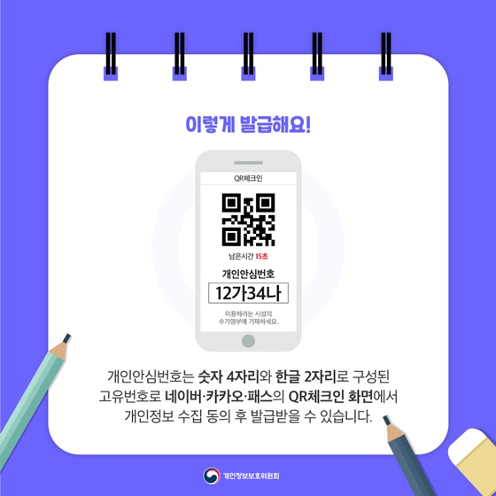 ÀüȹøÈ£ ´ë½Å »ç¿ëµÇ´Â °³ÀξȽɹøÈ£´Â ¼ýÀÚ 4ÀÚ¸®¿Í ÇÑ±Û 2ÀÚ¸®·Î ±¸¼ºµÈ °íÀ¯¹øÈ£´Ù. ÀÌ¿ëÀÚ´Â ³×À̹ö, īī¿À, ÆÐ½ºÀÇ QA üũÀΠȸ鿡¼ °³ÀÎÁ¤º¸ ¼öÁý µ¿ÀÇ ÈÄ¿¡ ¹ß±Þ¹ÞÀ» ¼ö ÀÖ´Ù. °³ÀξȽɹøÈ£´Â ÇÑ ¹ø ¹ß±ÞÀ» ¹Þ°Ô µÇ¸é Äڷγª19 Á¾½Ä ¶§±îÁö »ç¿ëµÇ¸ç, ¹Ù²îÁö ¾ÊÀ¸´Ï ¿Ü¿ö¼ ÀüȹøÈ£ ´ë½Å °è¼Ó »ç¿ëÇÒ ¼ö ÀÖ´Ù. À̸¦ ÀÌ¿ëÇÒ °æ¿ì ÈÞ´ëÀüÈ ¹øÈ£ À¯ÃâÀÇ ¿°·Á¸¦ ¿øÃµÀûÀ¸·Î Â÷´ÜÇÒ ¼ö ÀÖ°Ô µÇ´Ï, ÀüȹøÈ£ ±âÀÔÀÌ ²¨·ÁÁ³´ø À̵éÀº QR üũÀο¡ »ç¿ëÇϰí ÀÖ´Â ¾ÛÀ» ÅëÇØ ¾È½É¹øÈ£¸¦ È®ÀÎÇÏ°í »ç¿ëÇÏ¸é µÈ´Ù.