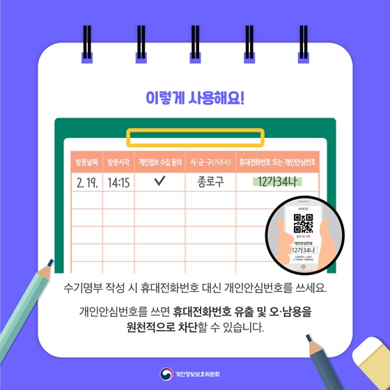 °³ÀÎÁ¤º¸º¸È£À§¿øÈ¸¿Í Á߾ӹ濪´ëÃ¥º»ºÎ´Â ±¹¹ÎµéÀÌ ½Ä´ç¡¤Ä«Æä µî ´ÙÁßÀÌ¿ë½Ã¼³ ¹æ¹® ½Ã ¾È½ÉÇÏ°í ¼ö±â¸íºÎ¸¦ ÀÛ¼ºÇÒ ¼ö ÀÖµµ·Ï ±âÁ¸ ÀüȹøÈ£ ´ë½Å Áö³ 2¿ù 19ÀÏ µµÀÔÇÑ °³ÀξȽɹøÈ£¸¦ ¾²µµ·Ï ¼ö±â¸íºÎ ÁöħÀ» °³¼±ÇÏ¿© 4¿ù 8ÀϺÎÅÍ ½ÃÇàÇÒ °ÍÀ» º¸µµÀڷḦ ÅëÇØ ¹àÇû´Ù. »ç¾÷ÀÚµéÀº °³¼±µÈ ¼ö±â¸íºÎ ¾ç½ÄÀ» Áúº´°ü¸®Ã» ´©¸®Áý ¹× °¢ Áö¹æÀÚÄ¡´Üü¿¡¼ ´Ù¿î·Îµå¹Þ¾Æ »ç¿ëÇÒ ¼ö ÀÖÀ¸¸ç, °³¼± ¼ö±â¸íºÎ´Â Áö¹æÀÚÄ¡´Üü¿Í ÇÕµ¿À¸·Î ´ÙÁßÀÌ¿ë½Ã¼³, ½Ã±º±¸ ¹Î¿ø¼¾ÅÍ, Áֹμ¾ÅÍ, ¹Ú¹°°ü µî¿¡ Àû±ØÀûÀ¸·Î ¹èÆ÷ÇØ ±¹¹ÎµéÀÌ °³ÀξȽɹøÈ£¸¦ »ç¿ëÇϵµ·Ï È«º¸ÇÒ ¹æÄ§ÀÌ´Ù.