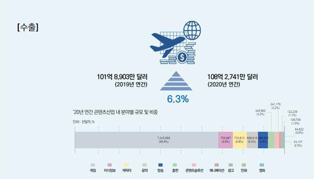 2020³âÀÇ ¿¬°£ ÄÜÅÙÃ÷»ê¾÷ ¼öÃâ¾×Àº Àü³â ´ëºñ 6.3%°¡ Áõ°¡ÇÑ 108¾ï 3õ¸¸ ´Þ·¯·Î Áý°èµÆ´Ù. ¹æÅº¼Ò³â´Ü, ±â»ýÃæ·Î ´ëÇ¥µÇ´Â ÇÑ·ù ÄÜÅÙÃ÷ÀÇ ¼ºÀåÀ¸·Î ÀÎÇØ, ¼öÃâ¾× 100¾ï ´Þ·¯¸¦ óÀ½À¸·Î µ¹ÆÄÇÑ 2019³â¿¡ À̾î À۳⿡µµ ¼ºÀå±âÁ¶´Â À̾îÁ³´Ù. ¼öÃâ¾×ÀÇ 66.9%¸¦ Â÷ÁöÇÏ´Â °ÍÀº °ÔÀÓÀ¸·Î, Àü³â ´ëºñ 8.8%°¡ Áõ°¡ÇÑ 72¾ï 5õ¸¸ ´Þ·¯ÀÇ ½ÇÀûÀ̾ú°í, ÃâÆÇ, ¿µÈ, ¸¸È À帣¿¡¼µµ ¼ºÀå¼¼¸¦ º¸¿´´Ù. ¹Ý¸é ÄܼƮ µî ´ë¸éÇà»ç¸¦ Áß½ÃÇÏ´Â À帣µéÀº ¼öÃâ¿¡ À־µ °¨¼Ò¼¼¸¦ ±â·ÏÇÑ °ÍÀ¸·Î ³ªÅ¸³µ´Ù.