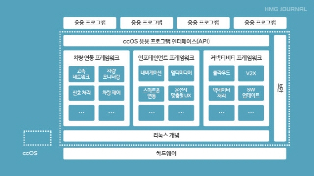 Çö´ëÂ÷±×·ìÀº ¼øÂ÷ÀûÀ¸·Î ÀÚü OS¸¦ Àû¿ëÇØ, ³»³âºÎÅÍ´Â ±×·ì Àüü·Î ÀÌ·¯ÇÑ ¹æÄ§À» È®»ê½Ãų ¹æÄ§ÀÌ´Ù. »õ OS´Â ¿ì¼± Çö´ëÀÚµ¿Â÷, ±â¾ÆÀÚµ¿Â÷ÀÇ Ç¥ÁØÇü 6¼¼´ë ¿Àµð¿À, ºñµð¿À ³»ºñ°ÔÀ̼Ç(AVN)¿¡ Àû¿ëµÈ´Ù. Çö´ëÂ÷±×·ìÀÌ ³»³â¿¡ µµÀÔÇÒ Ç¥ÁØÇü 6¼¼´ë AVNÀº µ¶ÀÚ °³¹ßÇÑ ¸®´ª½º ±â¹ÝÀÇ Ä¿³ØÆ¼µåÄ« ¿î¿ëü°è(ccOS)¸¦ äÅÃÇÑ °ÍÀ¸·Î È®ÀεȴÙ. À̵éÀº ccOS¸¦ ÀÎÆ÷ÅÙ¸ÕÆ®¿¡ ¿ì¼± µµÀÔÇÑ ÈÄ Â÷·® Àüü·Î À̸¦ È®»ê½Ãų °èȹÀÌ´Ù.