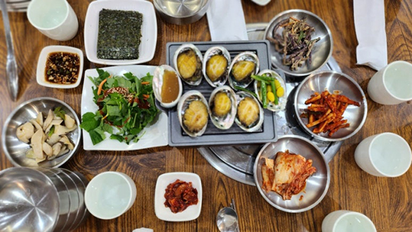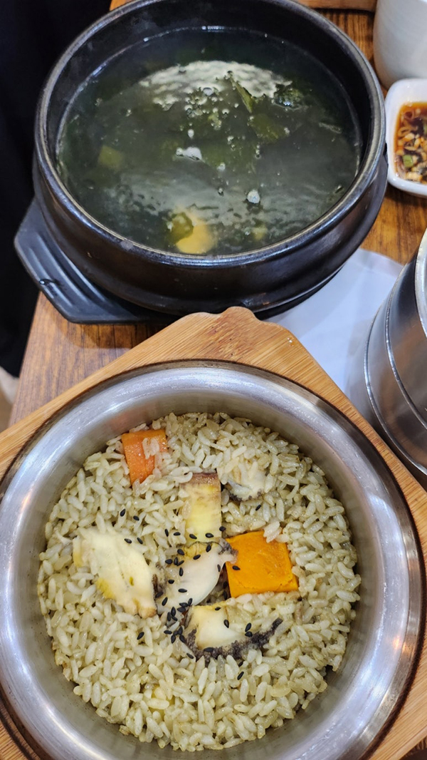 °ðÀÌ¾î ´ëÇ¥ ¸Þ´ºÀÎ 'Àüº¹ ¼Ü¹ä'ÀÌ µîÀåÇß´Ù. ±èÀÌ ¸ð¶ô¸ð¶ô ÇǾî¿À¸£´Â ¼Ü¶Ñ²±À» ¿ÀÚ, Àüº¹ ³»ÀåÀ¸·Î Áö¾î ÀºÀºÇÑ ³ì»ö ºûÀ» ¶ì´Â ¹ä À§·Î ÅÁ÷ÇÑ Àüº¹°ú ´ÜÈ£¹Ú, ÀºÇà µîÀÌ ¸ÔÀ½Á÷½º·´°Ô ¿Ã¶ó°¡ ÀÖ´Ù. Àüº¹ÀÇ °í¼ÒÇÏ°í ½Ô½Î¸§ÇÑ Ç³¹Ì°¡ ¹ä¾Ë ÇϳªÇϳª¿¡ ±í°Ô ¹è¾îÀÖ´Ù. ¹äÀ» ±×¸©¿¡ ´ú¾î³½ µÚ ¼Ü¿¡ ¹Ì¿ª±¹À» ºÎ¾î ¸¸µå´Â ±¸¼öÇÑ ´©·îÁö´Â ÀÌ ¸Þ´ºÀÇ È·æÁ¡Á¤ÀÌ´Ù. ÇÔ²² ³ª¿Â ¸¶¸¥ ±è¿¡ ¹äÀ» ½Î¼ ¾ç³äÀå¿¡ Âï¾î ¸ÔÀ¸¸é, ¹Ù´ÙÀÇ ÇâÀÌ ÀÔ¾È °¡µæ ÆÛÁ®³ª°£´Ù.