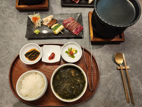 µåµð¾î ÀÌ ÄÚ½ºÀÇ ´ë´Ü¿ø. °³ÀΠȷο¡ ´ã±ä ¶ß°Å¿î ºñÀåź°ú ÇÔ²², ¾Æ±î º¸¹°»óÀÚ¿¡¼ º¸¾Ò´ø ¹Ù·Î ±× 'ÇÑ¿ì 䳡'ÀÌ Á¤°¥ÇÏ°Ô ´ã°Ü ³ª¿Â´Ù. ¼±¸íÇÑ ¼±È«ºûÀÇ ÃÖ»ó±Þ Çѿ츦 ºÒÆÇ¿¡ ¿Ã¸®ÀÚ °í¼ÒÇÑ ÇâÀÌ ÇǾî¿À¸¥´Ù. ÀԾȿ¡¼ ÅÍÁ® ³ª¿À´Â dzºÎÇÑ À°Áó°ú ³ì¾Æ³»¸®´Â µíÇÑ ºÎµå·¯¿òÀº ´õ ÀÌ»ó ¼³¸íÀÌ ÇÊ¿ä ¾ø´Â, ÀÌ ÄÚ½ºÀÇ Á¤Á¡ÀÌ´Ù. ¿©±â¿¡ ÁøÇÑ '¹Ì¿ª±¹'°ú °í½½°í½½ÇÑ 'Èò½Ò¹ä'À¸·Î ±¸¼ºµÈ '¹Ý»ó'ÀÌ ÇÔ²²Çϸç, ºñ·Î¼Ò ¿Ïº®ÇÏ°í µçµçÇÑ ÇÑ ³¢ ½Ä»ç°¡ ¿Ï¼ºµÈ´Ù.