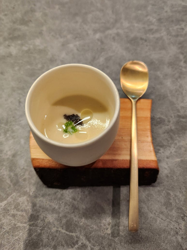 * Æ®·¯Çà ½ºÇÁ: ½Ä»çÀÇ ½ÃÀÛÀº ÁøÇÑ Æ®·¯ÇÃÀÇ ÇâÀÌ ´ã±ä µû¶æÇÑ ½ºÇÁ¿´´Ù. ÀÔ¾ÈÀ» ºÎµå·´°Ô °¨½Î´Â Å©¸®¹ÌÇÑ Áú°¨°ú ÄÚ³¡À» ¸Éµµ´Â ³óÈÄÇÑ Æ®·¯ÇÃÀÇ Ç³¹Ì°¡ °¨°¢À» ±ú¿ì¸ç ½Ä¿åÀ» µ¸¿î´Ù.