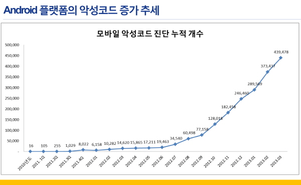 Áö±ÝÀº ¼ö¹é °³, ¼öõ °³ÀÇ ¾Ç¼ºÄڵ尡 ¸ÅÀÏ ½ñ¾ÆÁ® ³ª¿À°í ÀÖ´Â »óȲÀÌ´Ù. ƯÈ÷ 2012³â 6¿ù±îÁö´Â ÀáÀáÇÏ´ø ¾Ç¼ºÄڵ尡 µ¿³â 7¿ùºÎÅÍ Áõ°¡Çϱ⠽ÃÀÛÇÏ´õ´Ï ÀÌÈÄ ±âÇϱ޼öÀûÀ¸·Î Áõ°¡Çϰí ÀÖ´Ù. ÀÌ·¯ÇÑ Áõ°¡ ÀÌÀ¯´Â ÇöÀç ´ëºÎºÐÀÇ ¾Ç¼ºÄڵ尡 ¾Èµå·ÎÀ̵å Ç÷§Æû¿¡¼ ¹ß»ýÇϰí ÀÖ´Ù´Â °Í°ú ±¹³» ½º¸¶Æ®Æù ½ÃÀå¿¡¼ ¾Èµå·ÎÀ̵åÀÇ Á¡À¯À²ÀÌ 90%¿¡ À°¹ÚÇϰí ÀÖ´Ù´Â µ¥¼ ãÀ» ¼ö ÀÖ´Ù. ƯÈ÷, Áö³ 2012³â ÇϹݱâºÎÅÍ ¾Èµå·ÎÀ̵åÀÇ ±Ô¸ð°¡ º»°ÝÀûÀ¸·Î ´Ã¾î³ ÈĺÎÅÍ´Â ÇØÄ¿µéÀÌ ³ë¸± ¼ö ÀÖ´Â °ø°Ý´ë»óÀÌ ±×¸¸Å ÇÔ²² ´Ã¾î³ °ÍÀÌ ¾Ç¼ºÄÚµå Áõ°¡ÀÇ 1Â÷ÀûÀÎ ÀÌÀ¯´Ù.