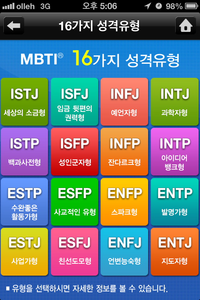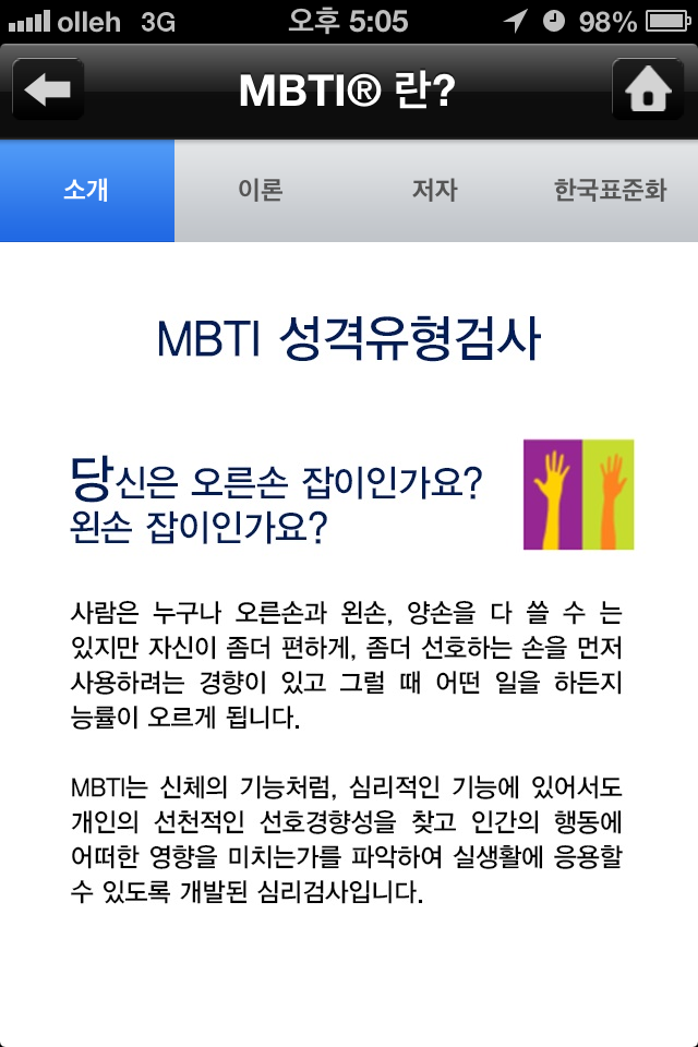 MBTI´Â À¶(Carl G. Jung)ÀÌ ¼³¸íÇÑ À¯ÇüÀÌ·ÐÀ» ¹ÙÅÁÀ¸·Î ¸ð³à°ü°èÀÎ Briggs¿Í Myers°¡ °³¹ßÇÑ ¼º°ÝÀ¯Çü ÁöÇ¥·Î¼, ÀڽŰú ŸÀÎÀÇ ¼º°Ý ¿ªµ¿À» ÀÌÇØÇÏ´Â Àü¼¼°èÀûÀ¸·Î °¡Àå ¸¹ÀÌ È°¿ëµÇ´Â ¼º°ÝÀ¯Çü °Ë»ç´Ù. MBTI ¾ÛÀº °ø½Å·Â ÀÖ´Â ½É¸®°Ë»ç µµ±¸ MBTI¸¦ ¾Ë¸®±â À§ÇØ ±¹³»ÆÇ±Ç ¼ÒÀ¯ÀÚÀÎ ¿¡¼¼½ºÅ¸¿¡¼ ¸¸µé¾úÀ¸¸ç, MBTI°¡ ¾î¶² °Ë»çÀÌ°í ¾î¶»°Ô Ȱ¿ëµÉ ¼ö ÀÖ´ÂÁö¿¡ °üÇÑ Á¤È®ÇÑ Á¤º¸¸¦ ¾Ë ¼ö ÀÖ´Ù.