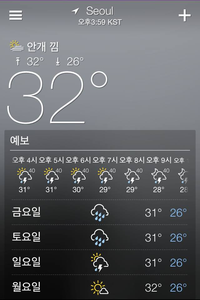 ´Ù¾çÇÑ ³¯¾¾ ¾ÛÀÌ ÀÖÁö¸¸ ±â´É¼º°ú µðÀÚÀÎÀûÀÎ ¿ä¼Ò ¾î´À Çϳª ºüÁöÁö ¾Ê´Â ³¯¾¾ ¾ÛÀ» ¼Ò°³ÇÑ´Ù. ¾ßÈÄ ³¯¾¾´Â ±âº»ÀûÀÎ ³¯¾¾ Á¤º¸»Ó¸¸ ¾Æ´Ï¶ó ÃÖ°í±â¿Â, ÃÖÀú±â¿Â, ½Ã°£´ëº° ±â¿Â, ÇÑ ÁÖ °£ ³¯¾¾, dz¼Ó°ú ±â¾Ð, ´ÞÀÇ ÇüÅÂ, ÀÏÃâ, Àϸô ½Ã°£ µî ±¸Ã¼ÀûÀÎ ³¯¾¾ Á¤º¸±îÁö Á¦°øÇÑ´Ù. Çø®Ä¿¿¡¼ Á¦°øµÇ´Â ÇØ´ç Áö¿ªÀÇ »çÁøÀ» ·£´ýÀ¸·Î Àü¼ÛÇÏ¿© ´©±º°¡°¡ ¿Ã¸° ÇØ´ç Áö¿ªÀÇ »çÁøÀ» ¸¸³ª´Â Áñ°Å¿òµµ ½ò½òÇÏ´Ù. »ó¼¼ÇÑ ³¯¾¾ Á¤º¸, »ê¶æÇÑ UI, ÇØ´ç Áö¿ªÀÇ »çÁø±îÁö ¸ðµÎ ĪÂùÇØ ÁÖ°í ½ÍÀº ¾ÛÀÌ´Ù.