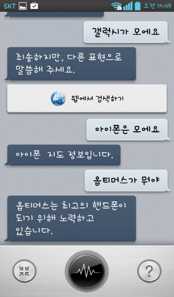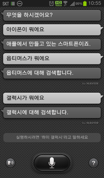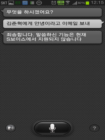 ½º¸¶Æ®º¸À̽º: °£´ÜÇÏ°í ½¬¿î ´Ü¾îÁ¶Â÷µµ ÀνÄÇÏÁö ¸øÇϰí 2°³ ÀÌ»óÀÇ ´Ü¾î°¡ À̾îÁú °æ¿ì¿¡´Â Áú¹®À» ´Ù½Ã ÇØ´Þ¶ó´Â ¿äûÀÌ À̾îÁø´Ù. ¶ÇÇÑ À½¼ºÀνÄÀ¸·Î »ç¿ëÇÒ ¼ö ÀÖ´Â ½º¸¶Æ®Æù ±â´Éµµ ´Ù¸¥ 3°³ÀÇ ¼ºñ½º¿Í ºñ±³ÇØ Çö°ÝÈ÷ ¶³¾îÁ® À½¼ºÀÎ½Ä ¼ºñ½ºÀÇ ÀåÁ¡À» ÀüÇô »ì¸®Áö ¸øÇϰí ÀÖ´Ù.