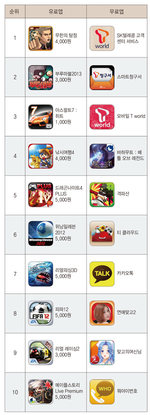 ¹«·á ºÎºÐ¿¡¼´Â ½º¸¶Æ®Ã»±¸¼ ¿Ü¿¡ ³ª¸ÓÁö 9°³ ¾ÛÀÌ ¸ðµÎ ¹Ù²î´Â Å« º¯È°¡ ÀÖ¾ú´Ù. ƯÈ÷ Áö³´Þ Ƽ½ºÅä¾î ¹«·á ºÎºÐ ¾Û ´ëºÎºÐÀÌ °ÔÀÓÀ̾ú´ø °Í¿¡ ¹ÝÇØ À̹ø ´ÞÀº ´Ù¾çÇÑ Á¾·ùÀÇ ¾ÛÀÌ »õ·Ó°Ô ÁøÀÔÇß´Ù. ±× Áß SKT °ü·Ã ¾ÛÀÌ ³ª¶õÈ÷ 1, 2, 3À§¸¦ Â÷ÁöÇÑ °ÍÀÌ °¡Àå µÎµå·¯Áø º¯È¿´°í, SKT Àü¿ë Ŭ¶ó¿ìµå ¼ºñ½ºÀΠƼ Ŭ¶ó¿ìµåµµ 7À§·Î »õ·Ó°Ô ¾ó±¼À» ³»¹Ð¾ú´Ù. ±×¹Û¿¡´Â ¹ÙÇϹ«Æ® : ¹èƲ ¿Àºê ·¹Àüµå¿Í °ÝÆÄ»ê, ¿¬¾Ö¸Â°í2, ¸Â°íÀÇ¿©½Å´Ô µîÀÇ ´Ù¾çÇÑ °ÔÀÓÀÌ »õ·Ó°Ô 10À§±Ç¿¡ À̸§À» ¿Ã·È´Ù. ÇÑÆí, ¸ð¸£´Â ¹øÈ£°¡ °É·Á¿À¸é ±× ¹øÈ£¸¦ ÀÚµ¿À¸·Î °Ë»öÇØ ¾Ë·ÁÁÖ´Â ¹¹¾ßÀ̹øÈ£ ¾ÛÀÌ À¯Æ¿¸®Æ¼ ¾ÛÀ¸·Î´Â À¯ÀÏÇÏ°Ô À̸§À» ¿Ã·È°í, īī¿ÀÅåÀÌ ¿À·£¸¸¿¡ 10À§ ¾È¿¡ À̸§À» ¿Ã¸° °ÍÀÌ ´«¿¡ ¶ç¾ú´Ù.