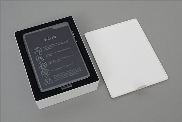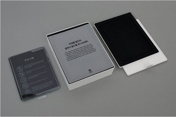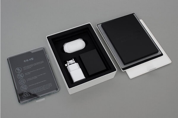 ¹Ú½º ¾Õ¸é¿¡ 'Galaxy'¶ó´Â ±ÛÀÚ°¡ ¹ÝÀ¸·Î Á¢Èù ±×¸²À¸·Î Æú´õºí ½º¸¶Æ®ÆùÀÇ Æ¯Â¡À» Ç¥ÇöÇϰí ÀÖ´Ù. »ï¼ºÀÌ Ã³À½ °¶·°½Ã Æúµå¸¦ °ø°³ÇÒ ¶§ÀÇ Æ¼Àú À̹ÌÁö¸¦ ¿¬»óÄÉ ÇÑ´Ù. ¹Ú½º Ãø¸é¿¡´Â 'SAMSUNG Galaxy Fold 5G'¶ó´Â ¹®±¸°¡ À½°¢À¸·Î »õ°ÜÁ® ÀÖ´Ù. ¹Ú½º´Â °Ñ¿¡ ÀÖ´Â °ËÁ¤»ö ¹Ú½º°¡ ¾ÈÂÊ¿¡ ÀÖ´Â Èò»ö Á¾ÀÌ ¹Ú½º¸¦ °¨½Î°í ÀÖ´Â ÇüÅ´Ù. ±¸¼ºÇ°À¸·Î´Â °¶·°½Ã ¹öÁ ºñ·ÔÇÑ ÃæÀü ¾î´ðÅÍ, Ç¥ÁØ USB-ŸÀÔC º¯È¯ ¾î´ðÅÍ µîÀÌ ÀÖ´Ù. ÃæÀü ¾î´ðÅÍ ¹Ù·Î ¿·¿¡ µé¾îÀÖ´Â ÀÛÀº °ËÀº»ö »óÀÚ¿¡´Â ÃæÀü ÄÉÀ̺í°ú °¶·°½Ã ¹öÁîÀÇ À̾îĸ ¹× À̾îÈÄÅ©°¡ µ¿ºÀµÇ¾î ÀÖÀ¸¸ç, »óÀÚ ¾È¿¡´Â »ç¿ë¼³¸í¼¿Í µ¥ÀÌÅÍ À̵¿¹æ¹ý µî 3Á¾ÀÇ Àμ⹰ÀÌ µé¾îÀÖ´Ù. °¶·°½Ã Æúµå º¸È£ ÄÉÀ̽ºµµ ÇÔ²² µé¾îÀÖ´Ù.