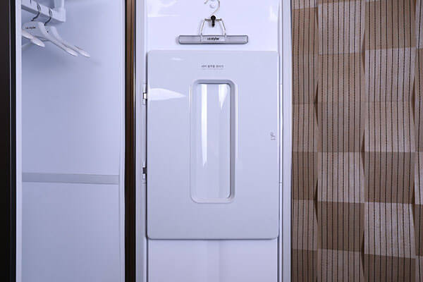 ´õ ¾ÈÂÊÀ¸·Î µé¾î°¡¸é Áß¾Ó¿¡ Ǫ¸¥ »ö»óÀ¸·Î ºû³ª°í ÀÖ´Â ¿øÇü ·¥ÇÁ°¡ ÀÖ´Ù. »ì±Õ ·¥ÇÁ·Î, ÀÇ·ù¿¡ ÀÖ´Â Áý¸ÕÁöÁøµå±â³ª °¢Á¾ À¯ÇØ ¼¼±Õ µîÀ» »ì±ÕÇØ ÁÖ´Â ±â´ÉÀ» ÇÑ´Ù. ±× ¾Æ·¡ÂÊÀ¸·Î´Â Æ®·ç½ºÆÀ±â°¡ ÀÖÀ¸¸ç, ³»ºÎ ½ÃÆ®¸¦ ºÐ¸®Çؼ ¼¶À¯À¯¿¬Á¦ ½ÃÆ®¸¦ ³Ö¾îµÑ ¼ö ÀÖ´Ù. ÀÌ Æ®·ç½ºÆÀ ±â´ÉÀº ¸» ±×´ë·Î 'ÁøÂ¥ ½ºÆÀ'À» ÀÇ·ù¿¡ °ø±ÞÇØ ÁÖ´Â ±â´ÉÀ¸·Î, ½ÇÁ¦ ¹°À» ÀÌ¿ëÇÑ´Ù. ÇÏ´ÜÀÇ ¹°¹ö¸² ¹× ¹°º¸Ãæ ÄÀ» ÀÌ¿ëÇØ ¼ö½Ã·Î ¹°À» ¹ö¸®°í º¸ÃæÇØ ÁÖ¸é µÇ´Â ½Ã½ºÅÛÀÌ´Ù.