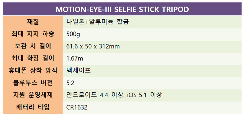 ¸Ó·¹ÀÌ ºí·çÅõ½º ¸Æ¼¼ÀÌÇÁ ¼¿Ä«ºÀ Motion-Eye-III´Â ¸Æ¼¼ÀÌÇÁ ¹æ½ÄÀÇ 1ÃÊ Å»ºÎÂø ±¸Á¶¿Í 7´Ü ±æÀÌ Á¶Àý ±â´ÉÀ» °áÇÕÇÑ ½Ç¿ëÀûÀÎ ¼¿Ä«ºÀÀÌ´Ù. ÃÖ´ë 170cm±îÁö È®ÀåµÇ´Â ¾Ë·ç¹Ì´½ ÇÕ±Ý ÁöÁö´ë¿Í ³í½½¸³ ÆÐµå¸¦ °®Ãá »ï°¢´ë ±¸Á¶·Î ¾ÈÁ¤ÀûÀÎ ÃÔ¿µÀÌ °¡´ÉÇϸç, ºí·çÅõ½º 5.2 ¸®¸ðÄÁÀ» ÅëÇØ ÃÖ´ë 10m °Å¸®¿¡¼µµ ¿ø°Ý ÃÔ¿µÀ» Áö¿øÇÑ´Ù. ¶ÇÇÑ 360µµ ȸÀü°ú 200µµ °¢µµ Á¶ÀýÀÌ °¡´ÉÇØ ´Ù¾çÇÑ ±¸µµ¸¦ ¼Õ½±°Ô ¿¬ÃâÇÒ ¼ö ÀÖ°í, ¸Æ¼¼ÀÌÇÁ ¸µÀÌ ±âº» Á¦°øµÇ¾î ¾î¶² ½º¸¶Æ®Æù¿¡¼µµ Ȱ¿ëÇÒ ¼ö ÀÖ´Ù. °¡º±°í È޴뼺ÀÌ ¶Ù¾î³ ¿ÃÀοø ¼¿Ä«ºÀÀ» ã´Â »ç¿ëÀÚ¶ó¸é ¸¸Á·½º·¯¿î ¼±ÅÃÀÌ µÉ °ÍÀ¸·Î º¸ÀδÙ.