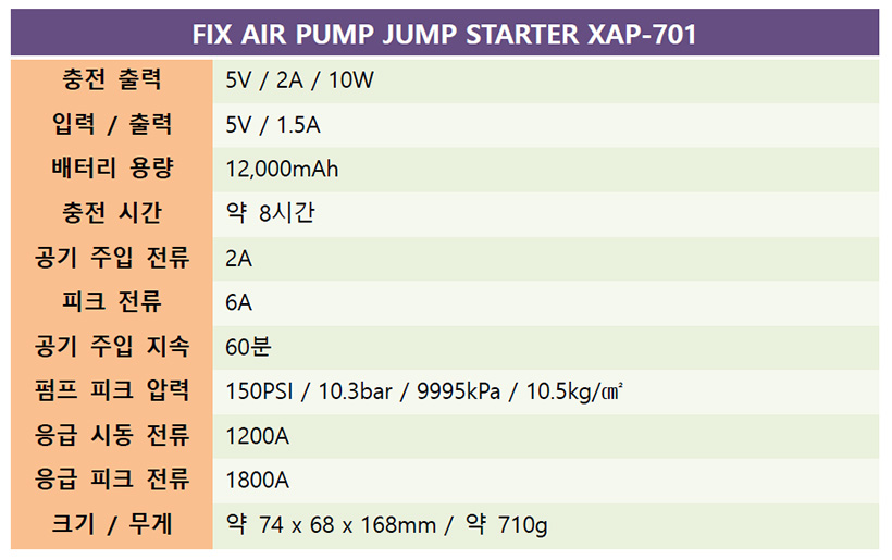 ÇȽº ¹«¼± Àüµ¿ ¿¡¾îÆßÇÁ Á¡ÇÁ½ºÅ¸ÅÍ XAP-701Àº ±ä±Þ »óȲÀ» ´ëºñÇÑ ÀåºñÀ̸鼵µ È޴뼺°ú ½Ç»ç¿ë¼ºÀ» ³õÄ¡Áö ¾Ê¾Ò´Ù. Á¡ÇÁ½ºÅ¸ÅÍ¿Í ¿¡¾îÆßÇÁ¿¡ º¸Á¶¹èÅ͸®¿Í ·£ÅϱîÁö Çϳª¿¡ ´ãÀº 4in1 ¼³°è, ¹èÅ͸® ¹æÀü ½Ã ¾à 30ÃÊ ¸¸¿¡ ½Ãµ¿ º¹±¸ °¡´ÉÇÑ °·ÂÇÑ 1800A ÇÇÅ© Àü·ù, ÃÖ´ë 150PSI/ºÐ´ç 20L °í¼Ó °ø±â ÁÖÀÔ, 12000mAh ´ë¿ë·® ¹èÅ͸®¿Í ´Ù¾çÇÑ ½º¸¶Æ®±â±â ÃæÀü Áö¿ø, SOS LED ¶óÀÌÆ®¿Í °úÁÖÀÔ ¹æÁö ¼³°è, ¿µÇÏ 20¡É~¿µ»ó 60¡É±îÁö ¾ÈÁ¤ ÀÛµ¿ µî ¸ÖÆ¼Åø ÀÌ»óÀÇ ¸¸´É¼ºÀ» °®Ãè´Ù. ±¹³»¿Ü Â÷Á¾°ú ¿ÀÅä¹ÙÀÌ, ÀÚÀü°Å, °ø·ù¿¡ Æ©ºê±îÁö Ä¿¹öÇÑ´Ù´Â Á¡µµ ¸Å·ÂÀûÀÌ´Ù. ÇȽº ¹«¼± Àüµ¿ ¿¡¾îÆßÇÁ Á¡ÇÁ½ºÅ¸ÅÍ XAP-701Àº ¾øÀ¸¸é ºÒÆíÇÏÁö¸¸, ÀÖÀ¸¸é À§±âÀÇ ½Ã°£À» ´Ü ¸î ºÐÀ¸·Î ÁÙ¿©ÁÖ´Â Àåºñ¶ó°í ÇÒ ¼ö ÀÖ´Ù. ¿îÀü °æÇèÀÌ ½×ÀÎ »ç¿ëÀÚÀϼö·Ï ºñ»ó »óȲ¿¡¼ Àåºñ Çϳª°¡ °¡Á®´ÙÁÖ´Â Áï½Ã ÇØ°áÀÇ °¡Ä¡¸¦ ´©±¸º¸´Ù Àß ¾Ë°í ÀÖÀ» °ÍÀÌ´Ù. ÀÏ»ó°ú ·¹Àú, ±×¸®°í À̸¥ ¾ÆÄ§ÀÇ Ãâ±Ù±æ±îÁö ¸ðµç »óȲ¿¡¼ ½Ã°£À» ÁöÄÑÁÖ´Â ÀÚµ¿Â÷ ¾×¼¼¼¸®¶ó´Â Ç¥ÇöÀÌ °¡Àå Á¤È®ÇÏ´Ù°í ÇÒ ¼ö ÀÖ´Ù.